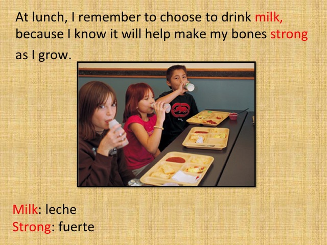 At lunch, I remember to choose to drink milk, because I know it will help make my bones strong as I grow.